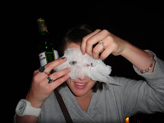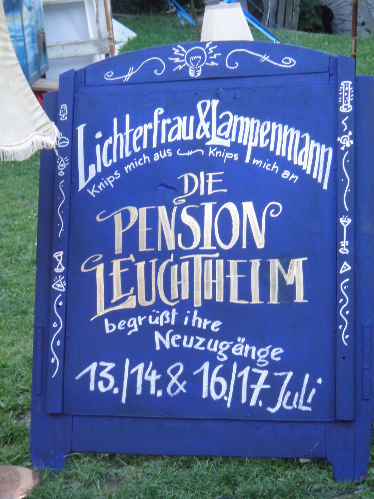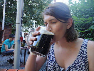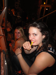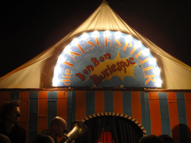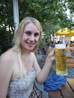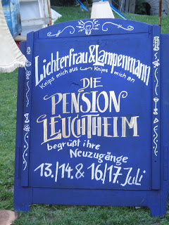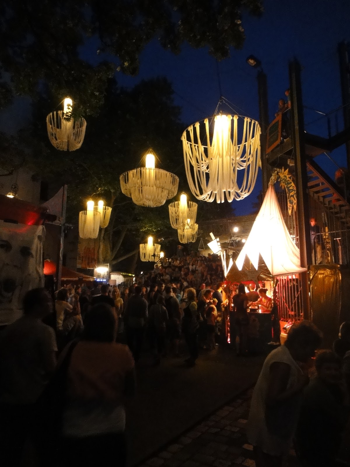 The night we arrived we met up with my good friend Gaby who brought an appropriate amount of British to our little party and we stumbled upon a traveling circus type deal that really is quite difficult to describe without getting literary and really descriptive. We entered through a garden and above our heads were these foams chandeliers that were there for the festival that lit up as the sun got lower. On the side of a fence leaned a great sign with all of the performances of the day and below a ticket booth and a trailer selling beer. After looking around and seeing all of the side acts that tried to get you to come into their booths we decided on an Israeli dramatic performance because it was the only one that wasn't in German and anyone could see. It was a very dramatic performance in a dark room. As we entered a man was already in character sawing at a small piece of wood and standing in the middle of a shallow pool that covered the floor and was filled to his ankles with muddy water that shined when the light moved around. Every action he took was painful for him, and three times different women came out and did a dance that reflected on life's mortatlity. One woman came out of a large blow up head and did a violent dance, the next came out of the water and had a baby doll on her hand (which gave everyone chills) and the third came out over our heads and danced on top of a white sheet the shook rapidly.